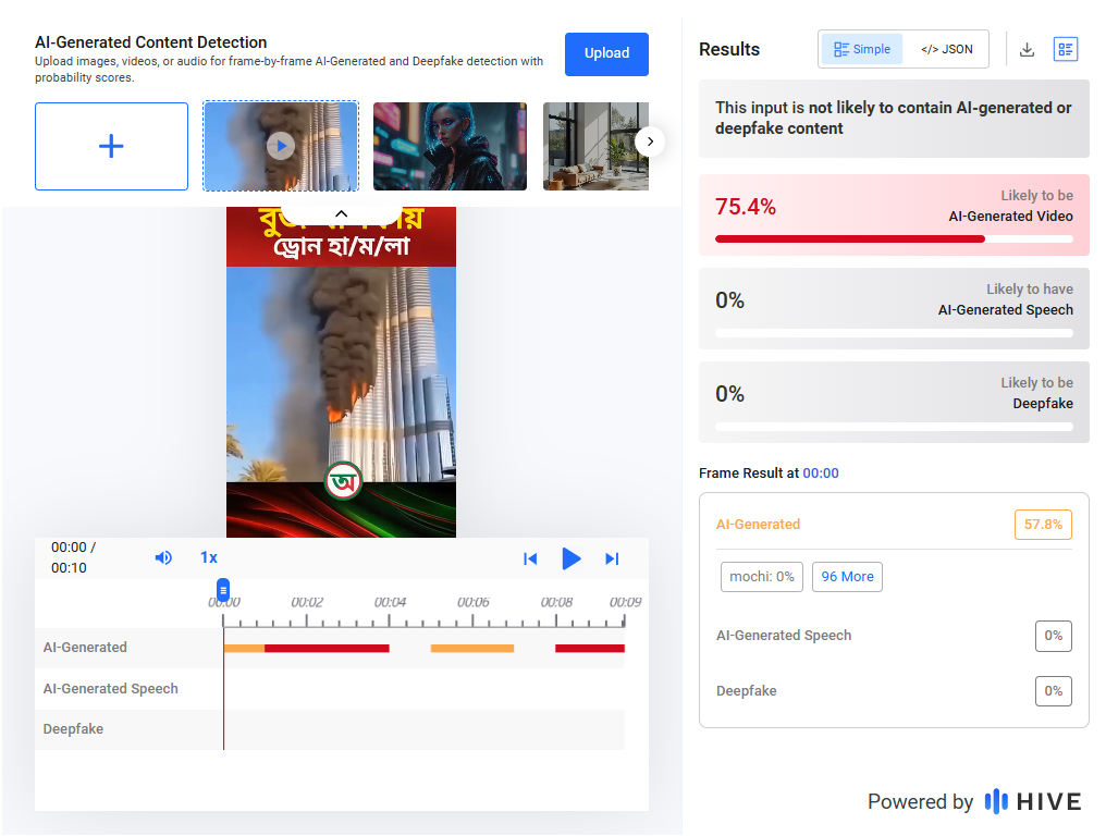 তারপর, আমরা ভিডিওটিকে sightengine, hivemoderation এর মত বিশ্বাসযোগ্য এআই নির্মিত ভিডিও শনাক্তকরণ টুলের মাধ্যমে যাচাই করি। টুলগুলোতে ইঙ্গিত করে ভিডিওটি এআই নির্মিত।
