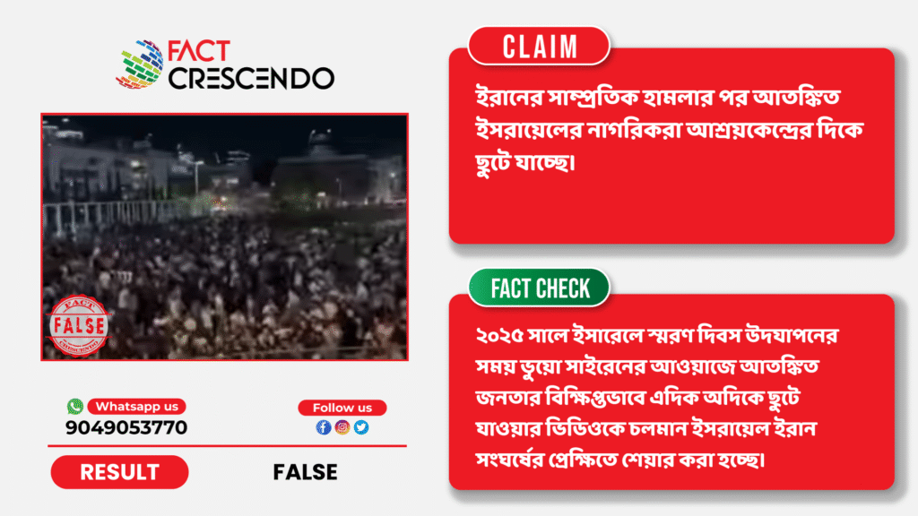 নিষ্কর্ষঃ তথ্য যাচাইয়ের মাধ্যমে ফ্যাক্ট ক্রিসেণ্ডো এই সিদ্ধান্তে উপনীত হয়েছে যে, ২০২৫ সালে ইসরায়েলে স্মরণ দিবস উদযাপনের সময় ভুয়ো সাইরেনের আওয়াজে আতঙ্কিত জনতার বিক্ষিপ্তভাবে এদিক-ওদিক ছুটে যাওয়ার ভিডিওকে চলমান ইসরায়েল-ইরান সংঘর্ষের প্রেক্ষিতে শেয়ার করা হচ্ছে।